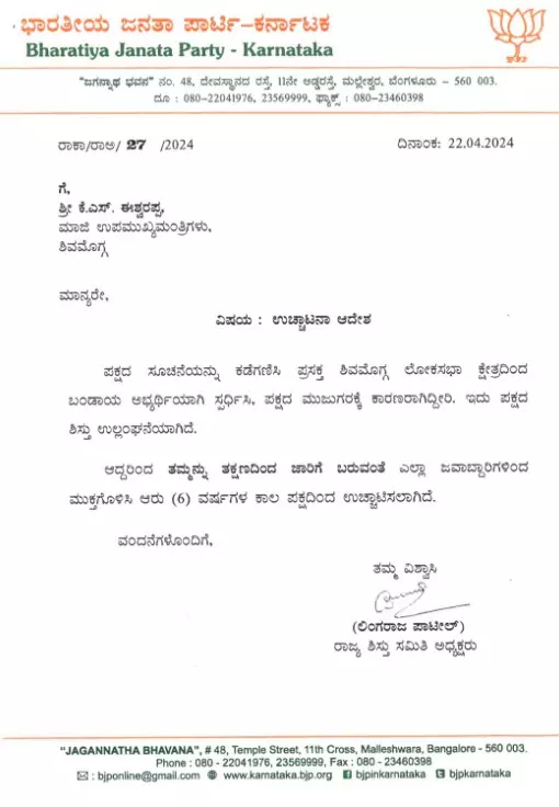 "Ignoring the party's directions, you are contesting as a rebel candidate from Shimoga Lok Sabha constituency, causing embarrassment to the party. This is violation of party discipline," state disciplinary committee president Lingaraj Patil said in the expulsion order.