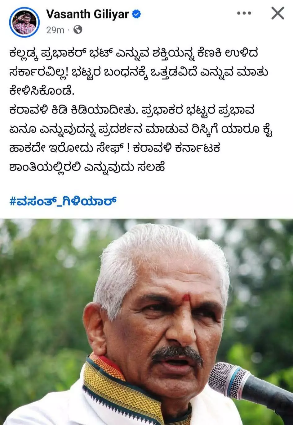 Mangaluru: A Facebook post claiming that “no government has survived after provoking Kalladka Prabhakar Bhat” has sparked outrage online, with many demanding legal action against the author for issuing an indirect threat that could disturb communal harmony.