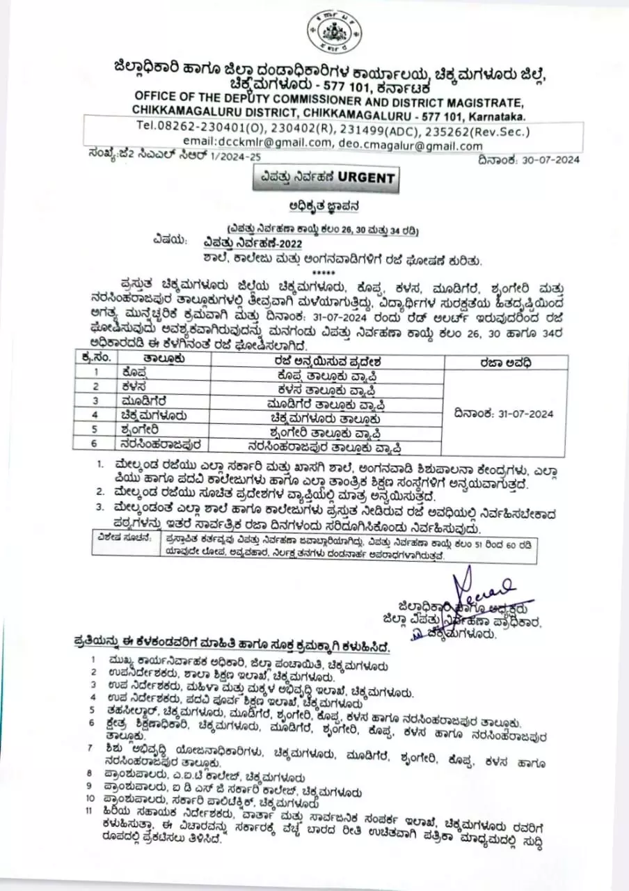 All Anganwadi centers, government and private primary schools, high schools, Pre-Univeristy colleges and degree colleges in Koppa, Kalasa, Mudigere, Chikkamagaluru, Sringeri, Narasimharajapur taluks will remain closed on Wednesday, read the order.