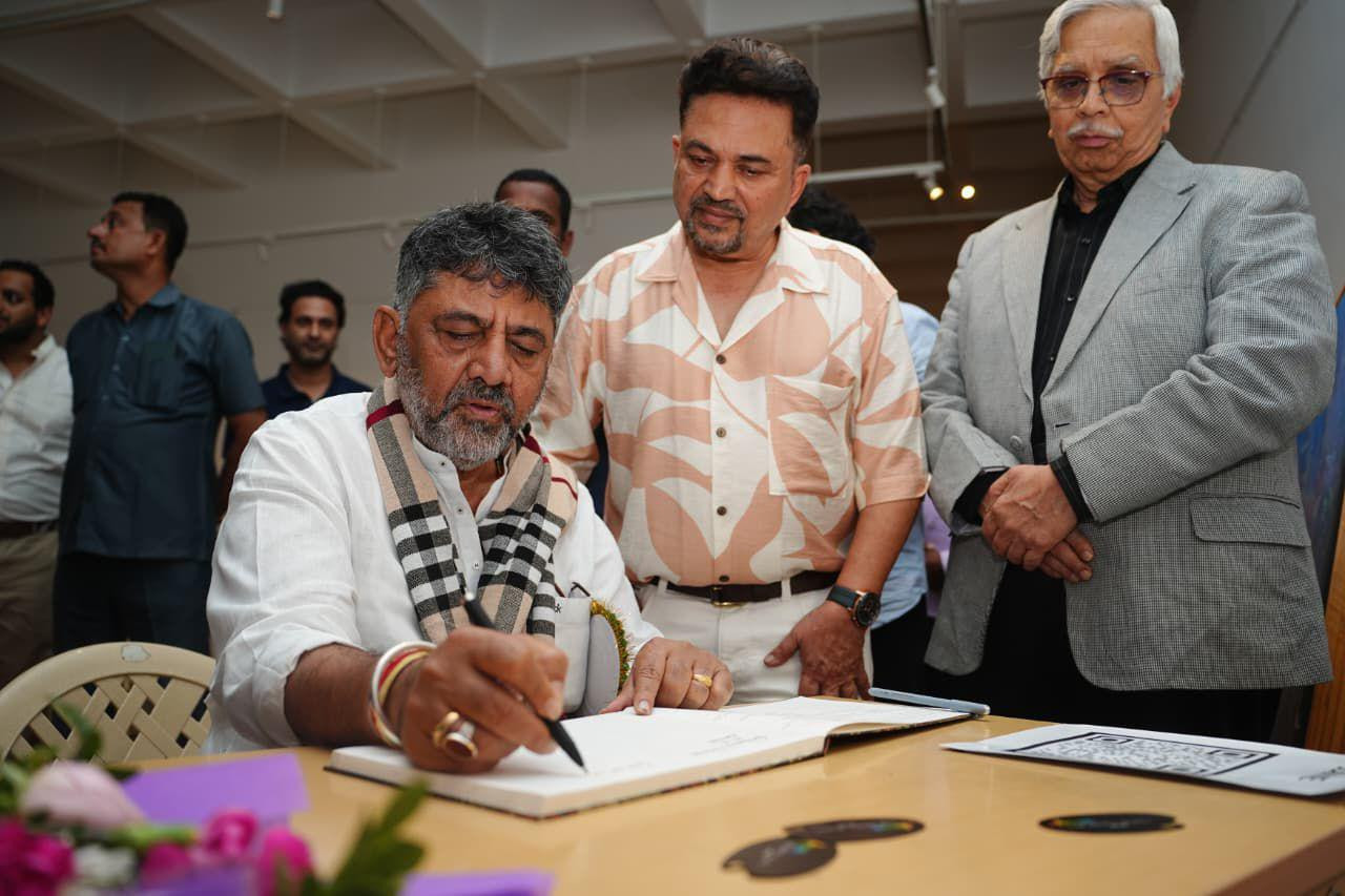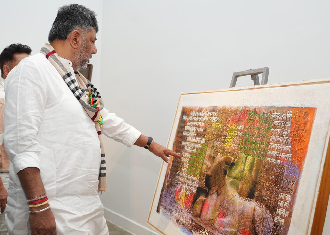 Bengaluru: Mangalorean artist Dr. Akther Hussain’s solo art exhibition “Vedic Inspirations” was inaugurated at the Karnataka Chitrakala Parishath in Bengaluru, in the presence of Deputy Chief Minister DK Shivakumar, Speaker UT Khader, Chief Minister’s Additional Secretary Anjum Parvez, and film actress Ramya, who graced the occasion.