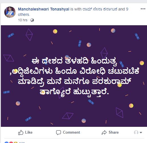 BJP Yuva Morcha state executive member Manchaleshwari Thonashala updated the controversial post in her Facebook account favouring Parashuram. In her post, it reads: “Hindutva is the foundation of this country. If anti-Hindu activities were done, every house will have Parashuram Waghmore”. Now this post has gone viral and created the controversy.