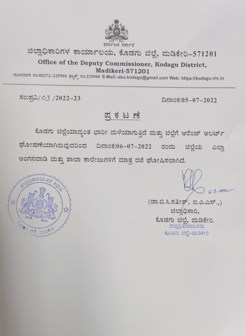 The order issued by the DC stated an orange alert was issued in the district and the colleges, schools, and Anganwadis in the district will remain closed on July 6 as a precautionary measure.