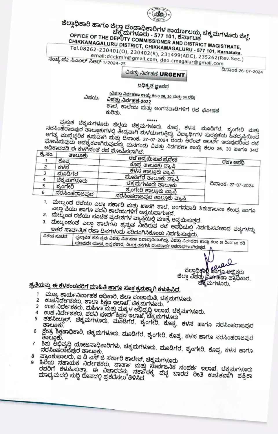 As per the order, all Anganwadi centers, Government, Private Primary & Higher schools, Pre-Univeristy colleges and degree colleges in Mudigere, Chikkamagaluru, Kalasa, Sringeri, Koppa, NR Pura will remain closed on Saturday.
