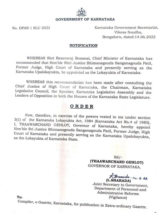 According to the appointment notification issued on the orders of Governor Thaawarchand Gehlot, Chief Minister Basavaraj Bommai had recommended that Justice Patil be appointed as the Lokayukta of Karnataka.