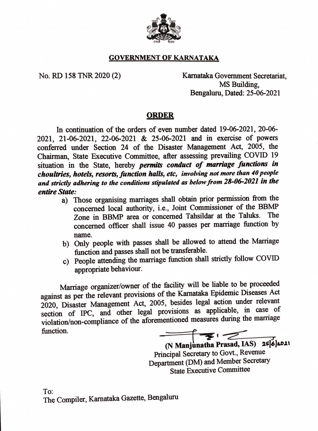 State hereby permits conduct of marriage functions in choultries, hotels, resorts, function halls, etc, involving not more than 40 people and strictly adhering to the conditions stipulated as below from 28-06-2021 in the entire State. pic.twitter.com/05igk7me9v