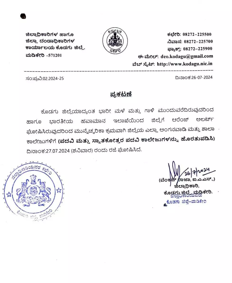 Madikeri: Amid heavy rains, Kodagu Deputy Commissioner Venkat Raja has issued order declaring holiday for all schools and Pre-University Colleges on Saturday, July 27. The order was issued as a precautionary measure in the backdrop of heavy rains lashing across the district.