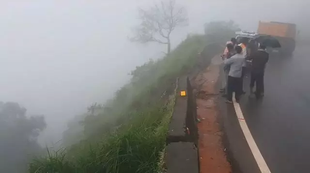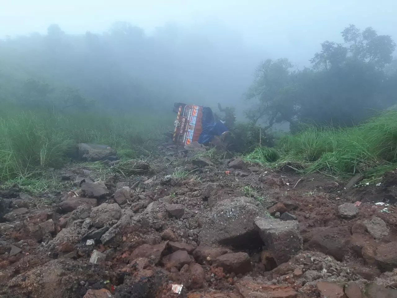 Chikkamagaluru: A truck driver and the cleaner had a narrow escape from death on Friday night as the truck toppled into a 100-foot abyss beside the Charmadi Ghat road at Somanakadu in Chikkamagaluru district, after the driver lost control over the truck as visibility was low due to the dense fog on the stretch, following heavy rain in the Ghats.