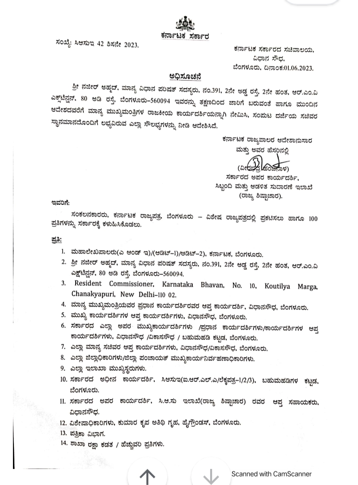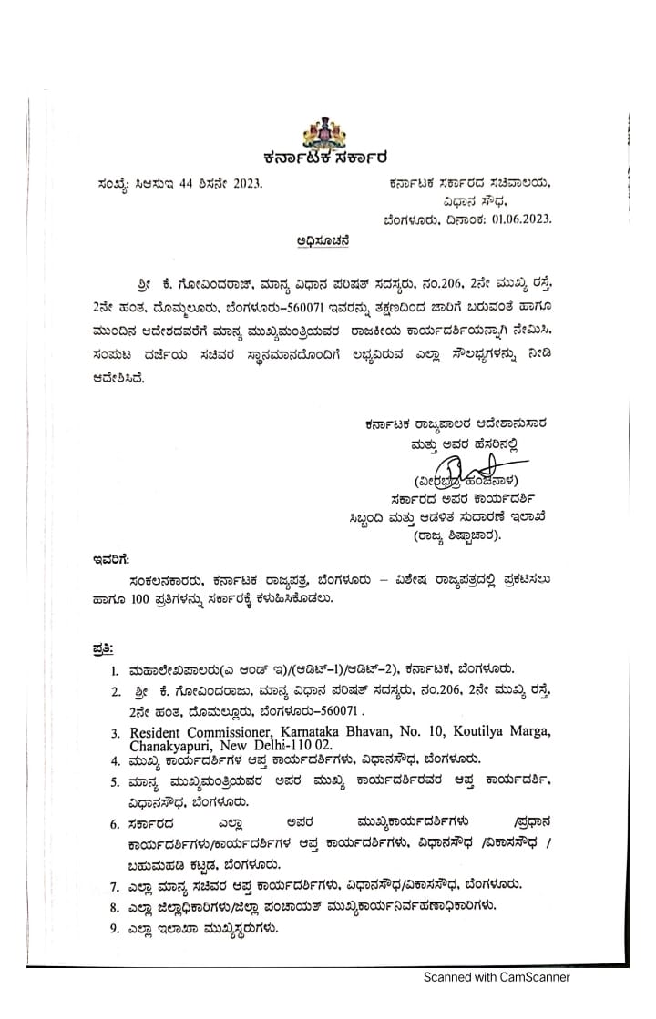 Naseer Ahmed, and Govindraj are both members of Congress party and represent the party in the state’s Legislative Council. They have been entrusted with the crucial responsibility of serving as political secretaries to CM Siddaramaiah. Their appointment is expected to enhance coordination and communication between the Chief Minister's office and the legislative bodies.