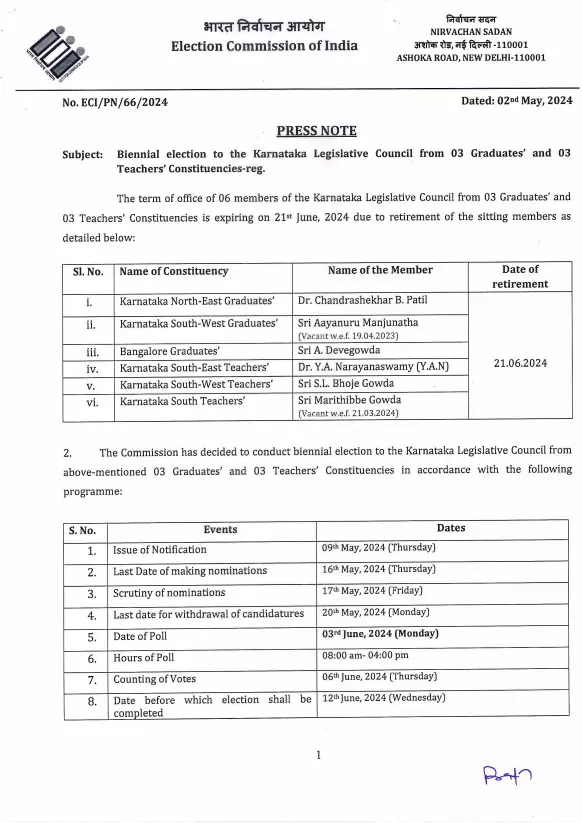 Bengaluru: The election to six members of legislative council seats in Karnataka, which will fall vacant following the retirement of the sitting members, will take place on June 3 and the counting of votes will happen on June 6, the Election Commission of India said on Thursday. These elections pertain to three graduates and three teachers constituencies.