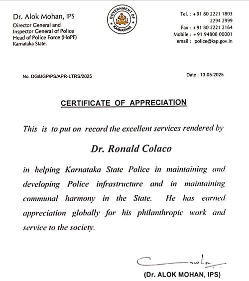 Bengaluru: Philanthropist and NRI entrepreneur Dr Ronald Colaco has received rare recognition from the Karnataka Police for his decades-long contribution to public service, police infrastructure development and efforts to promote communal harmony in the state.