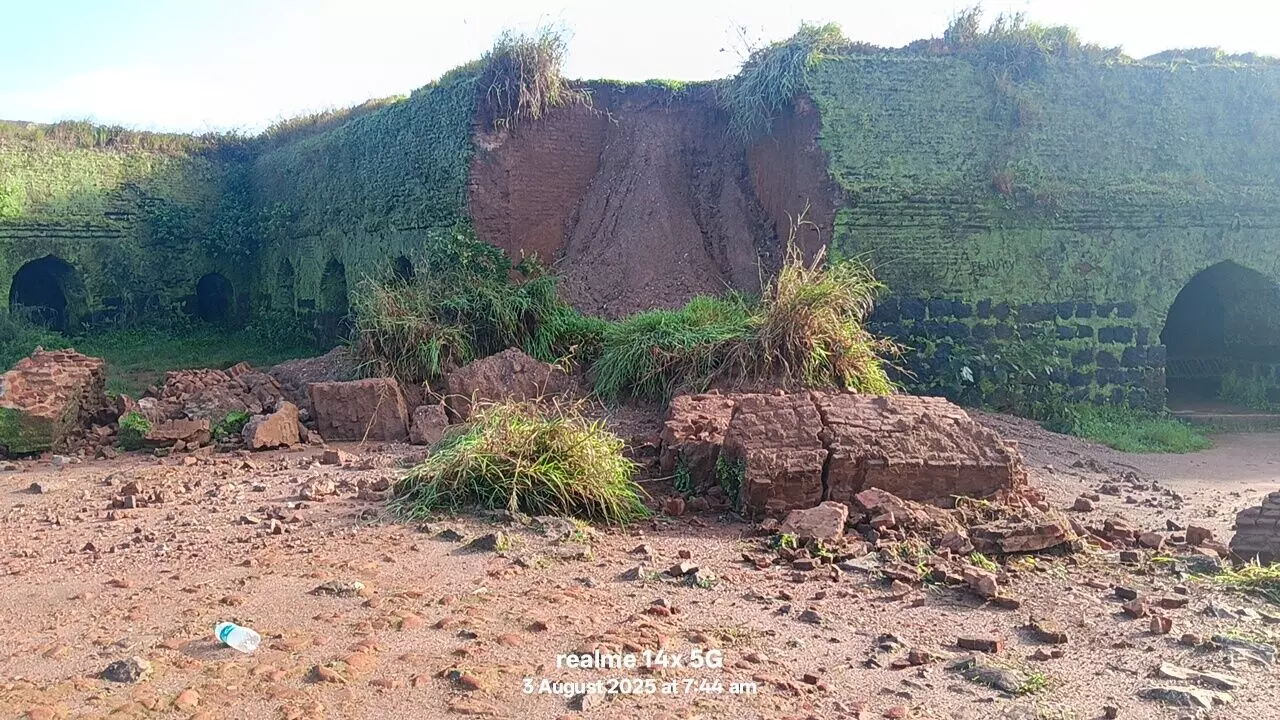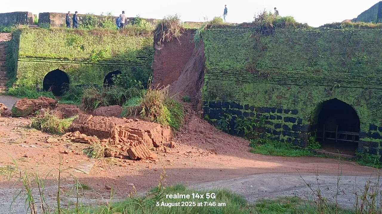 Sakleshpur: A section of the historic Manjarabad Fort in Sakleshpur has collapsed due to heavy rainfall that lashed the region on Saturday night. The damage came to light on Sunday morning when the fort’s security guard arrived for duty and noticed the collapsed portion.