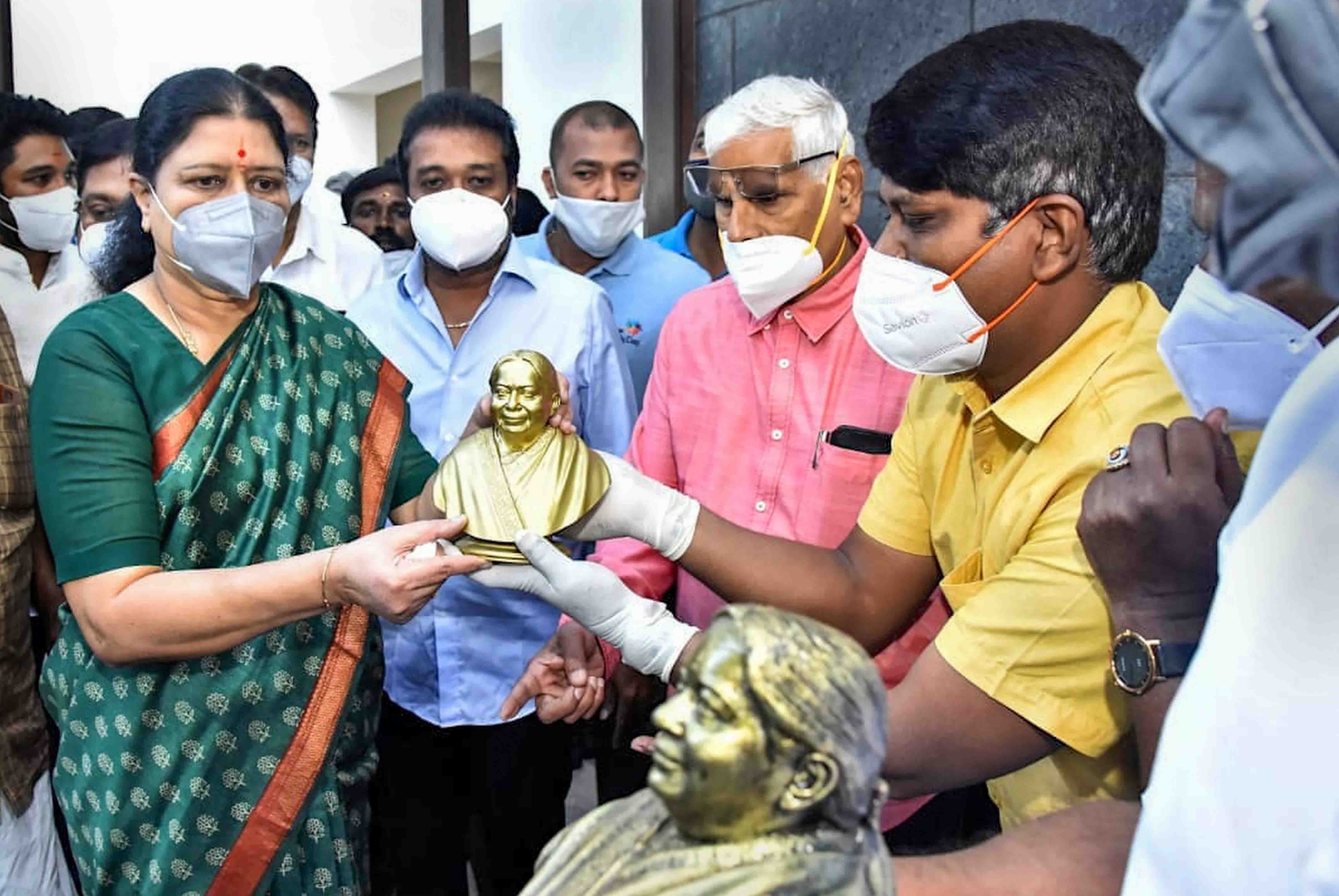 Expelled AIADMK leader VK Sasikala being feliciated on her return, after serving a jail term in a disproportionate assets case, in Krishnagiri district