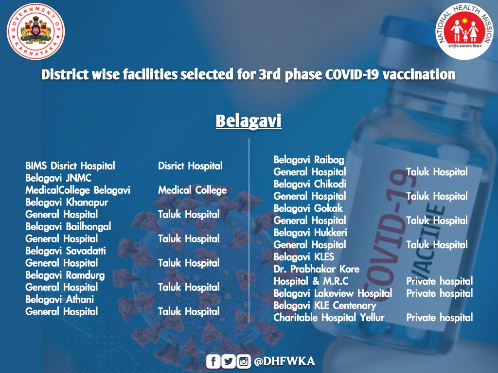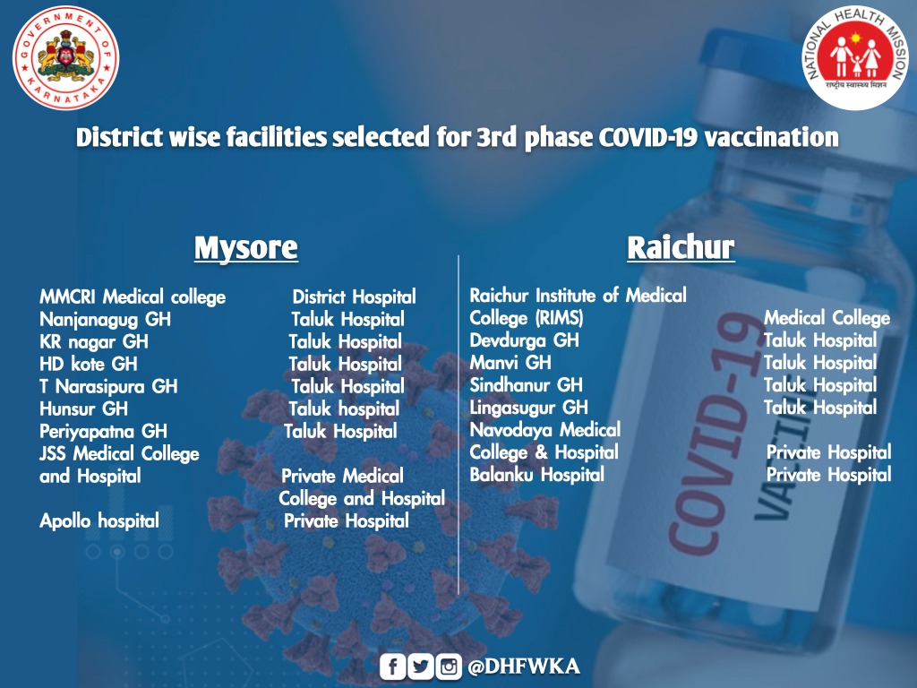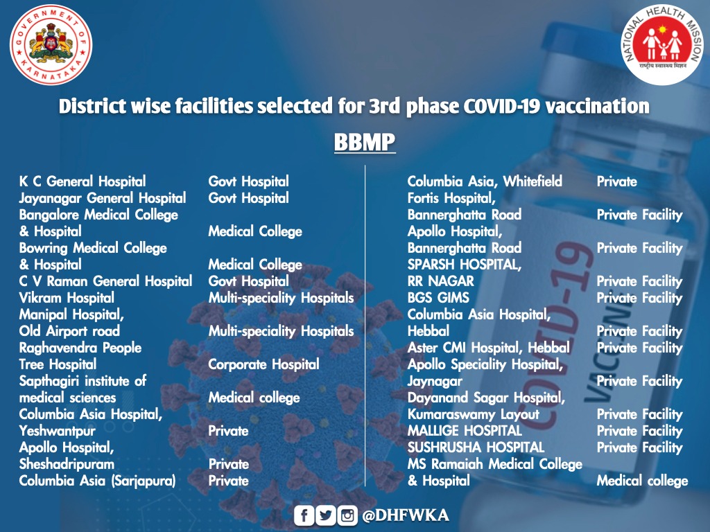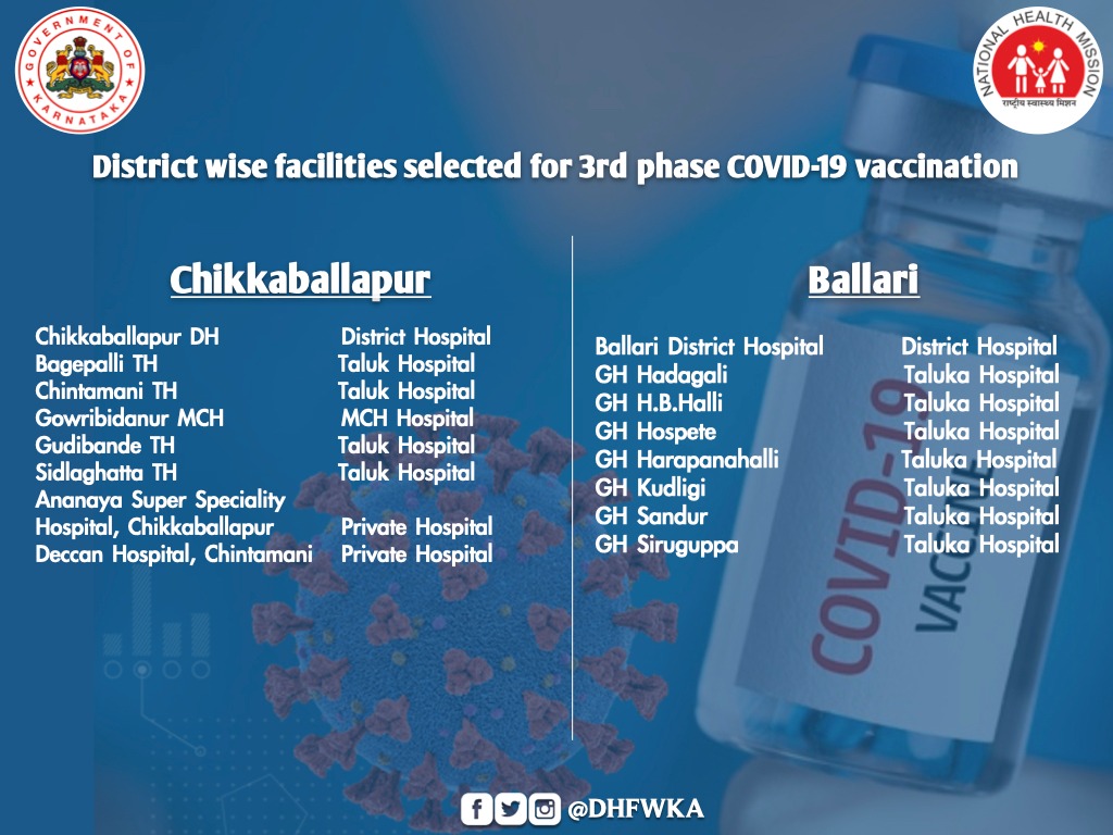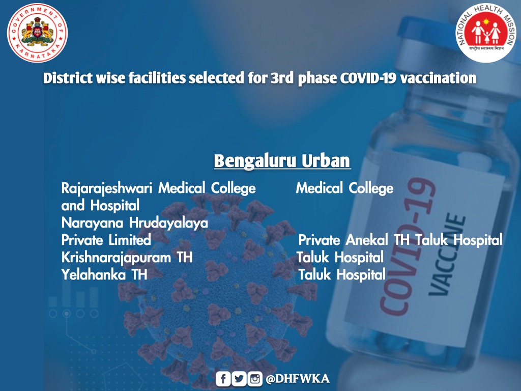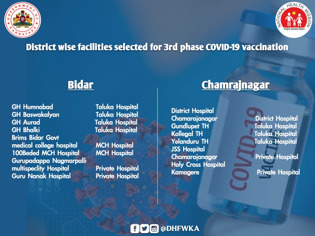 "In the initial phase, all taluk level hospitals, district level hospital and two identified private hospitals from each district and major hospitals of Bengaluru and 18 private health facilities from BBMP will implement COVID-19 vaccination from March 1,"a state health department note said.