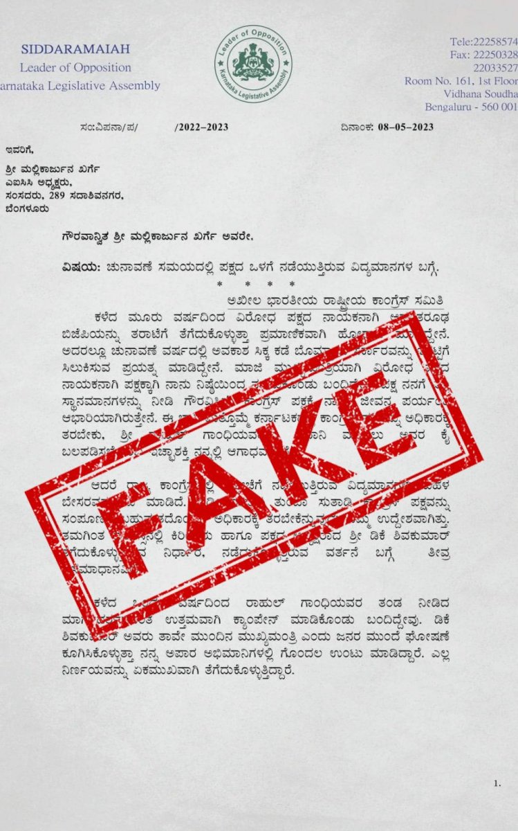 Bengaluru: Rumours of a complaint letter written by the Opposition Leader of the Karnataka Assembly, Siddaramaiah, against the President of the Karnataka Pradesh Congress Committee (KPCC), DK Shivakumar, have been declared fake by Siddaramaiah himself. The letter, addressed to AICC President Mallikarjun Kharge and dated May 8, has gone viral on social media. The letter attributed to Siddaramaiah accuses Shivakumar of making unilateral decisions and declaring himself as the Chief Minister in waiting, causing displeasure even among Siddaramaiah's personal supporters.