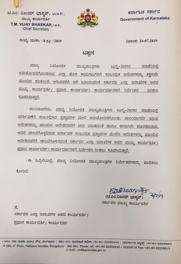 During the debate on the trust vote in the assembly, the BJP had accused the Congress-JD(S) coalition and the outgoing Chief Minister H D Kumaraswamy of clearing projects and transfer of officials, despite having lost majority.