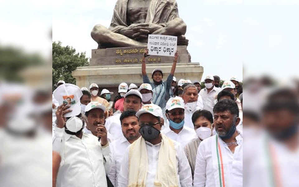 Karnataka Congress on Wednesday staged a protest in front of the Gandhi statue at the Vidhana Soudha, the seat of the state legislature here, against the ruling BJP for amending the APMC act, proposed nominations to gram panchayats by postponing elections and plans to amend labour laws, among other issues.