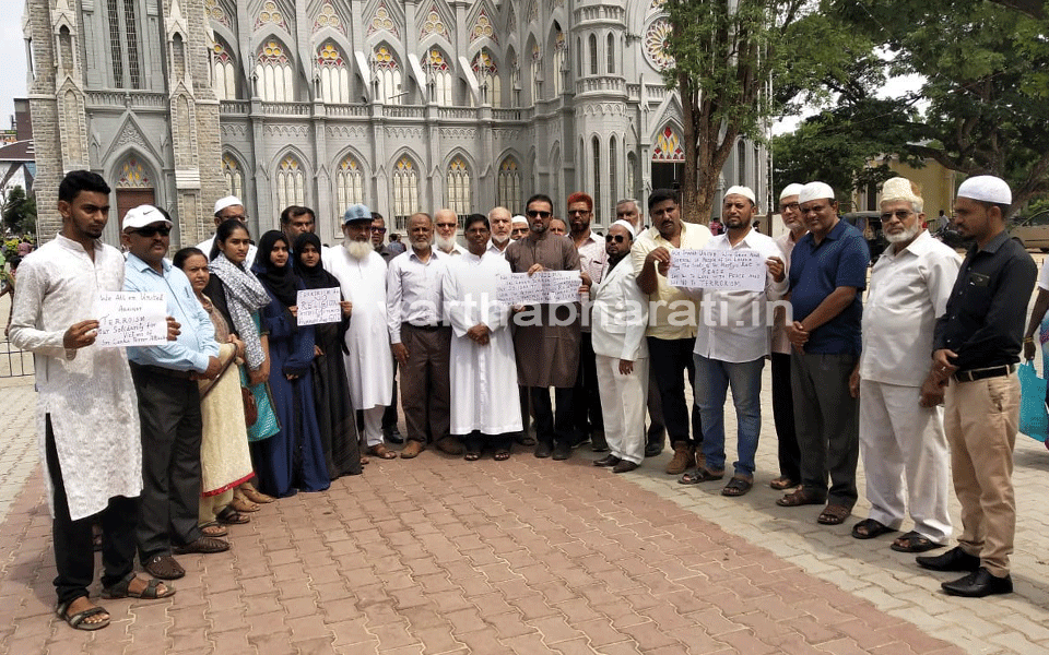 Mysuru: Muslims from across the city on Sunday morning gathered outside St Philomena church in the city to express solidarity with the Christian community following the Sri Lanka terror attacks that killed over 250 people.