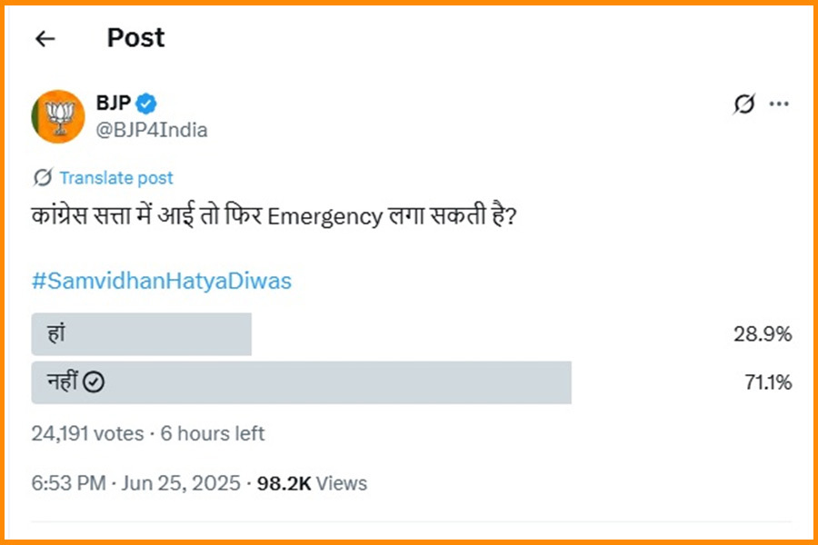 An online poll conducted by the BJP on its official X handle (@BJP4India) appears to have backfired, with over 70% of respondents rejecting the idea that the Congress would reimpose Emergency if it returned to power. The poll, launched on June 25 to coincide with the 50th anniversary of the Emergency imposed by then Prime Minister Indira Gandhi, aimed to stir public memory about the suspension of democratic rights in 1975.