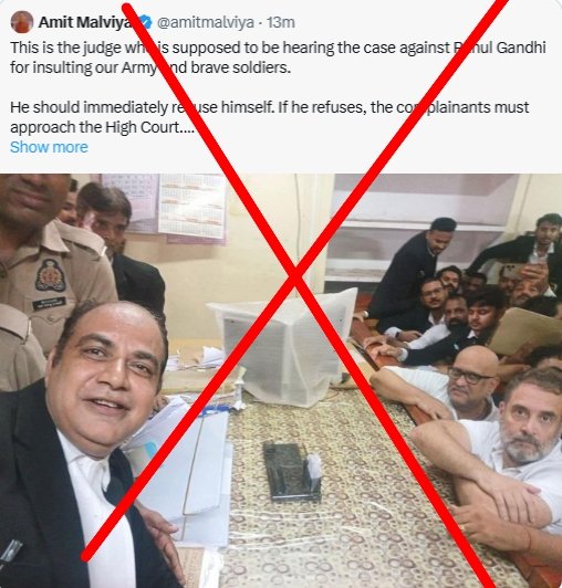 Lucknow, July 15 – A photograph of Congress leader Rahul Gandhi taken inside a Lucknow courtroom has sparked a wave of misinformation, after BJP IT Cell head Amit Malviya and others falsely claimed that the man taking a selfie with Gandhi was the judge hearing his case. The man in the image has now been identified as Advocate Syed Mahmood Hasan, not a member of the judiciary.