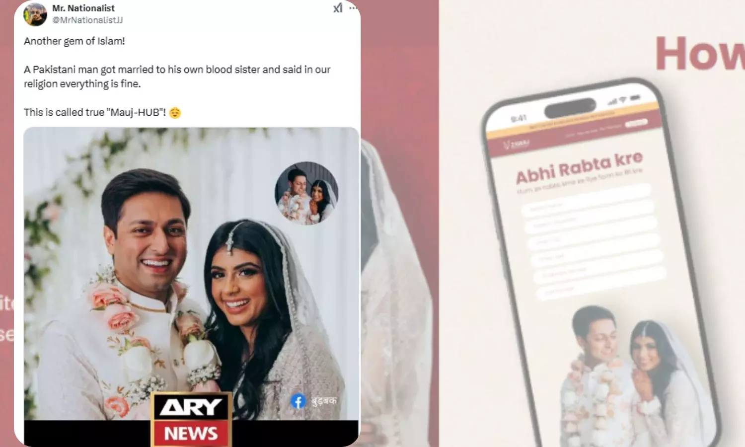 The viral post, showing the photo of a newly married couple with the ARY News channel logo, is captioned, “Another gem of Islam! A Pakistani man got married to his own blood sister and said in our religion everything is fine. This is called true "Mauj-HUB"!”
