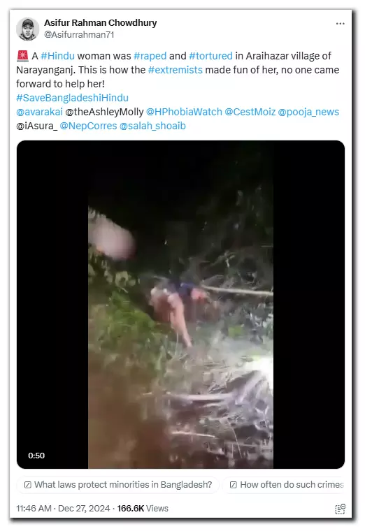 An X user posted the video with the caption, "A Hindu woman was raped and tortured in Araihazar village of Narayanganj. This is how the extremists made fun of her, no one came forward to help her!"