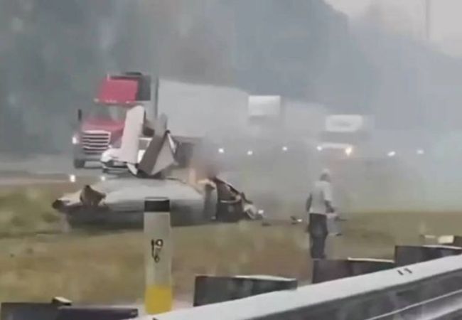 A small plane crashed along a major highway in southeastern Massachusetts early Monday amid rain and strong winds, killing both people on board and wounding another person on the ground, authorities said.