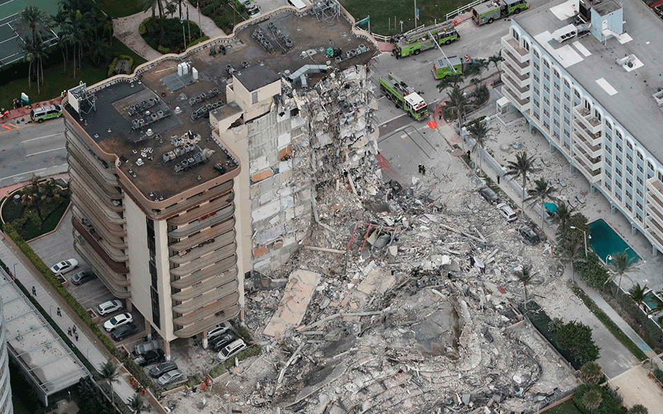 A beachfront condo building partially collapsed Thursday outside Miami, killing at least one person and trapping others in the tower that resembled a giant fractured dollhouse, with one side sheared away. Dozens of survivors were pulled out, and rescuers kept up a desperate search for more.
