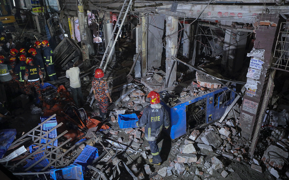 A powerful explosion that destroyed an old three-storey building in a crowded area here in Bangladesh's capital and killed at least seven people and injured around 400 others may have been caused by a faulty gas line or gas cylinders, authorities said on Monday.